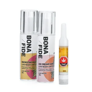 Bonafide premium Live Resin cartridges. Experience the entourage effect. This cartridge contains 1000mg of THC and other cannabinoids. We do not add any PG, VG, PEG, or MCT oil. Our customers’ health and safety are very important to us. Laboratory tested for quality and consistency.
