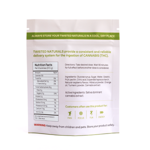 You’ll find 12 x 100mg Twisted Naturals gummies in each bag of High Dose Twisted Naturals.